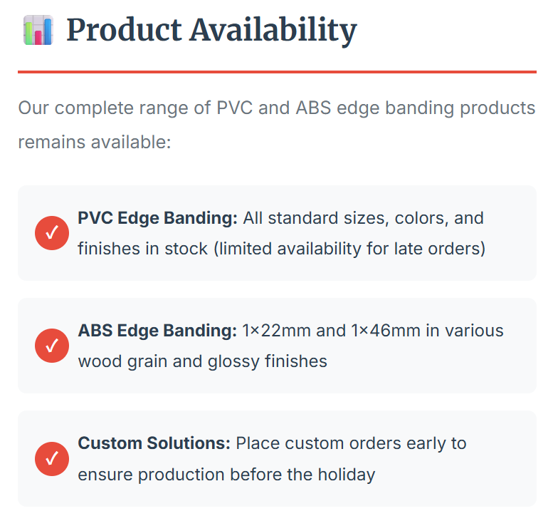 To ensure uninterrupted service and timely delivery of your PVC and ABS edge banding orders, please review the following important information regarding our holiday schedule and operational arrangements.